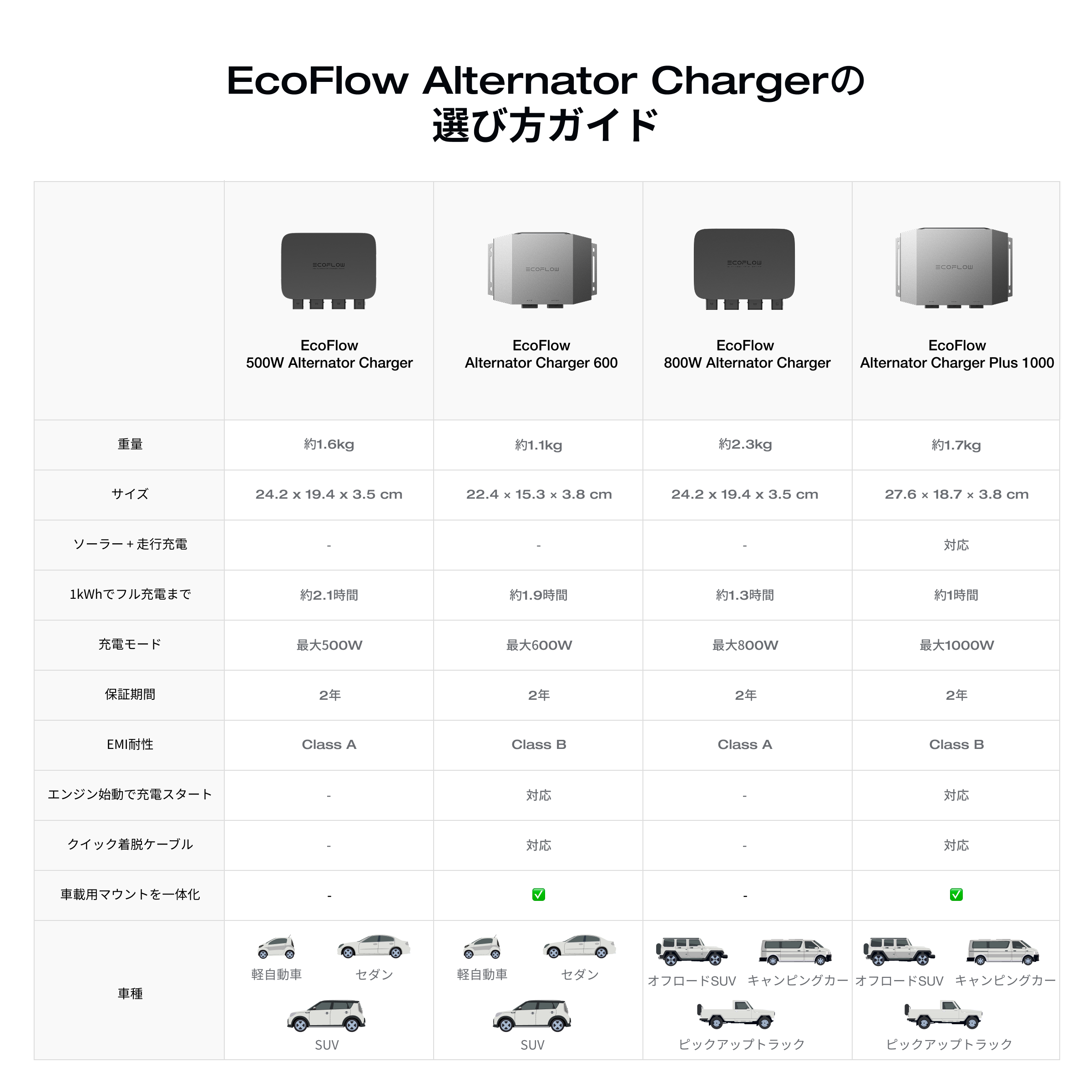 EcoFlow Alternator Chargerは、用途に合わせて出力が選べます。機能性や対応車種も製品によって異なるので、注意が必要です。走行充電器のおすすめ製品を紹介します。