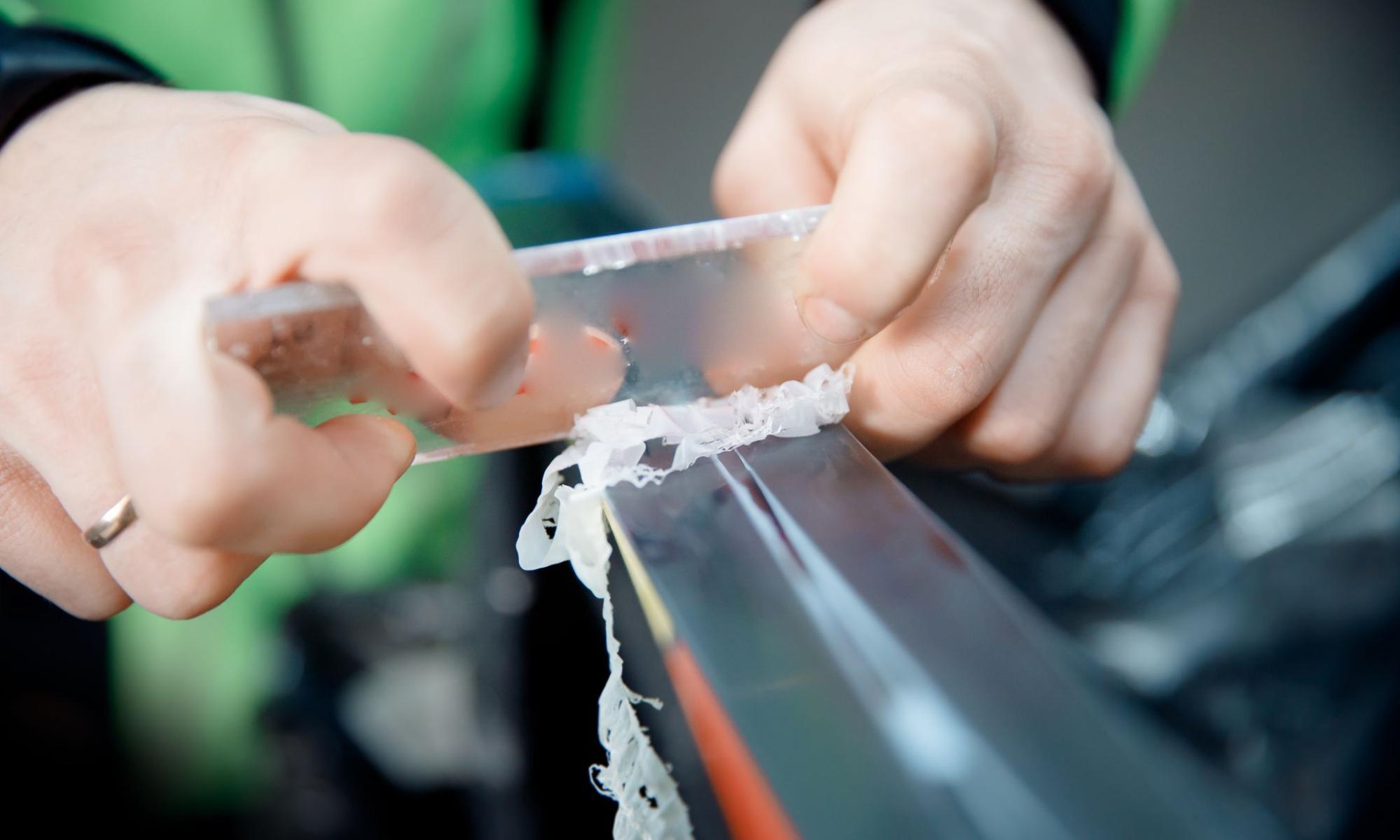 まずはリムーバーで古いワックスや汚れをしっかり落とし、滑走面を清潔にした上で新しいベースワックスをアイロンで塗り込みます。