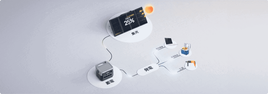 また、夜間のアウトドア活動ではソーラーパネルで充電したポータブル電源を使って照明を点灯させれば、安全性を高められるでしょう。